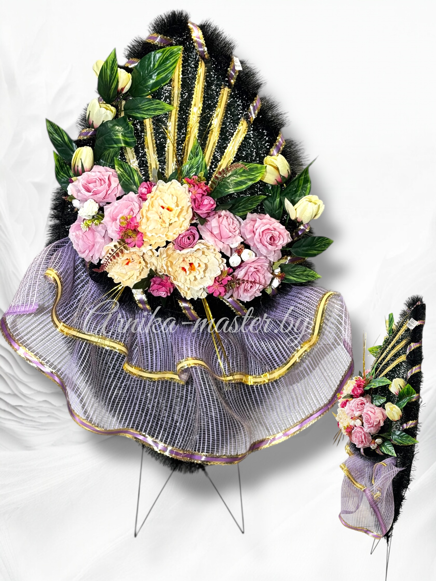 - Высота ножек: 25 см — элегантные ножки приподнимают венок, придавая ему устойчивость и подчёркивая его значимость, делая его заметным даже на большом расстоянии.