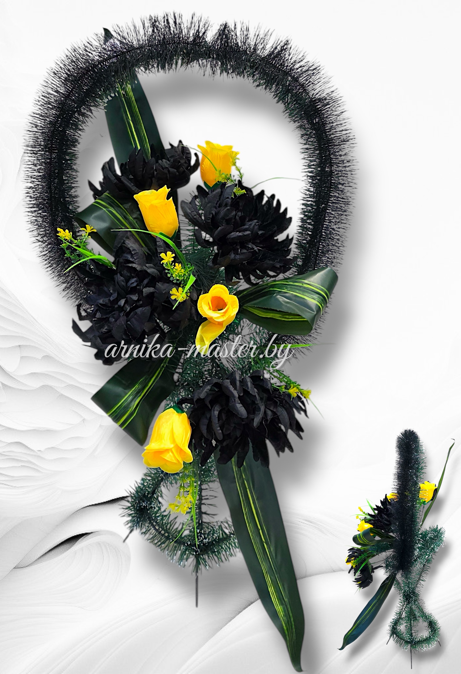 Эта траурная корзина представляет собой элегантную и торжественную композицию, призванную выразить глубокие соболезнования и почтение.