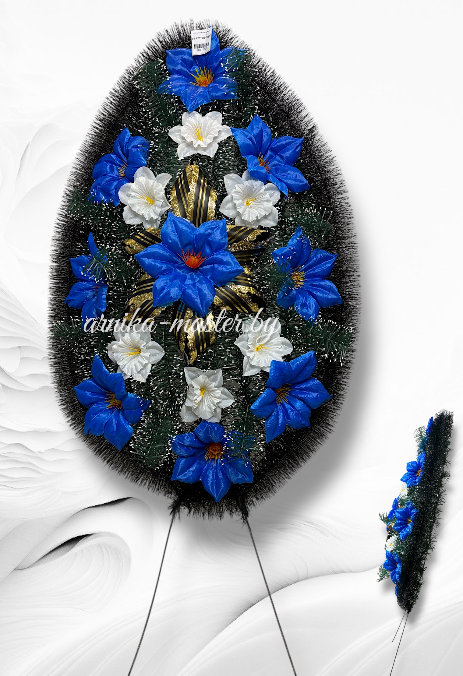 Купить венок ритуальный “Круговорот” возможно как оптом, так и в розницу. Высота венка с ногами 120 см, ширина 55 см. Высота ног ритуального венка составляет 40 см. Каркас отличается прочностью и надежностью. Этот венок является символом и знаком скорби.